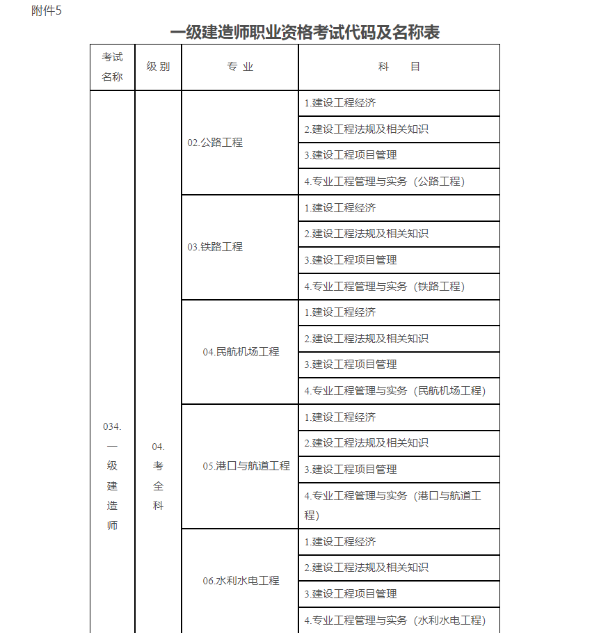 5.一級建造師職業(yè)資格考試代碼及名稱表
